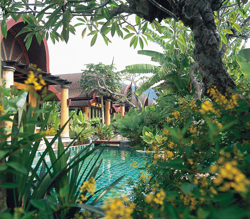 Durch das Tor in der gelben Mauer führt der Weg über eine Holzbrücke in einen berauschenden tropischen Garten. Kleine Wasserläufe und Teiche, üppiges Grün, leuchtende Farben einer tropischen Blütenpracht umschließen harmonisch den frei geformten Pool. Das kleine elegante Boutique-Resort im modernen Thai-Taksin-Stil wirkt auf uns wie eine Oase der Glückseeligkeit. Hier finden Sie in ruhiger Lage 34 luxuriöse Villen, entweder im Garten gelegen oder mit direktem Poolzugang. Über dem Swimmingpool thront ein großer Whirlpool von dem aus man die ganze Anlage und den herrlichen Garten betrachten kann.